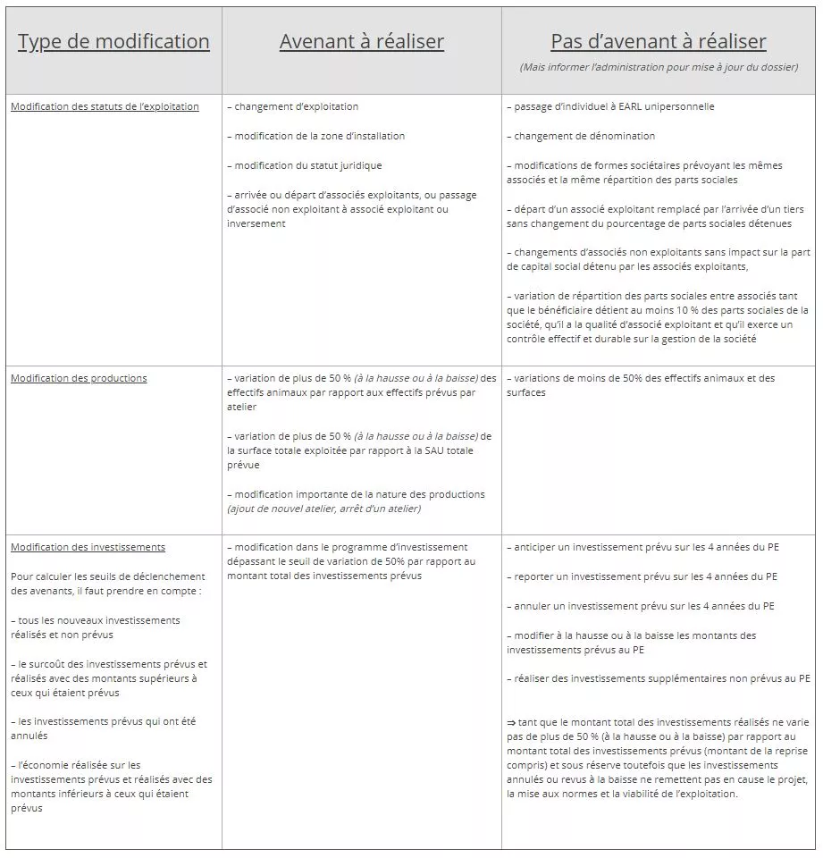 Important : tous les avenants doivent être déposés pendant la période de 4 ans du Plan d’Entreprise et le JA doit attendre la confirmation de l’enregistrement de son avenant pour entreprendre les modifications souhaitées. En effet, si l’administration refuse, le JA encourt le risque de perdre le bénéfice de ses aides.