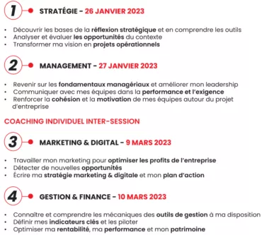 - 4 thèmes abordés : la stratégie, le management, le Marketing et Digital, la Gestion/ Finance